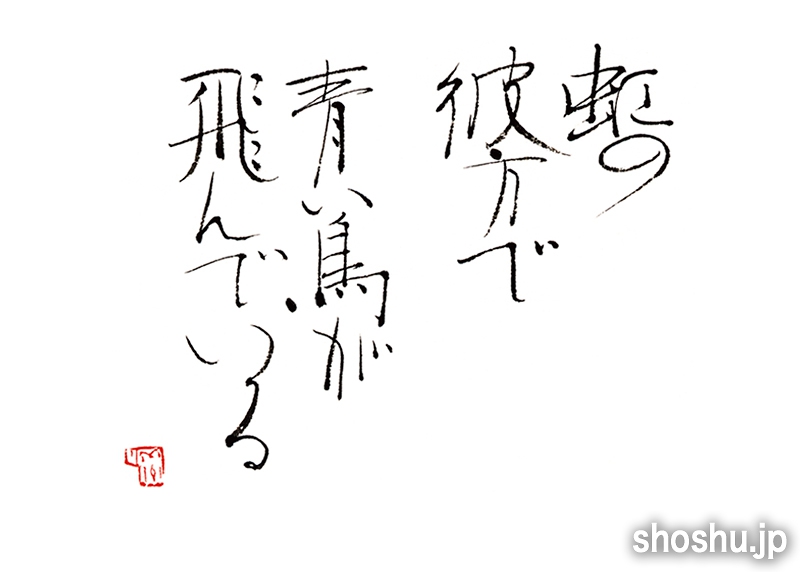 私が20代の終わり頃、「宮島詠士」の作品に衝撃を受けました。書線の周りが白く輝き、文字全体を包み込むようなニジミが広がっている。こんな表現があるのか、と私が持っていた書の概念が音を立てて崩れていきました。それ以来、宮島詠士の表現世界を目指して書法や素材研究を続け、30年ほどの歳月が過ぎました。そして今回、初めて宮島詠士へのオマージュ作品として「澄」を発表。まだまだ、まだまだ、お恥ずかしいレベルではありますが、是非見てやって下さい。 |